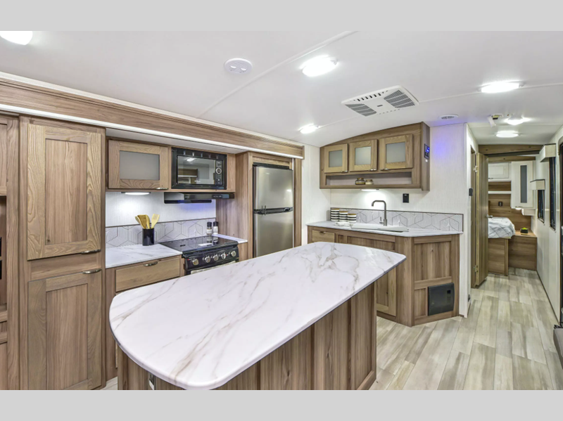 Each model features Azdel composite laminated walls, a fully molded, fiberglass cap, and a heated and enclosed underbelly to help extend your camping season. You'll also find hardwood residential cabinets with hidden hinges and seamless kitchen countertops. The exterior is just as impressive with triple entry steps with a telescoping handrail, power stabilizer and tongue jacks, and a 30" black glass main entry door.