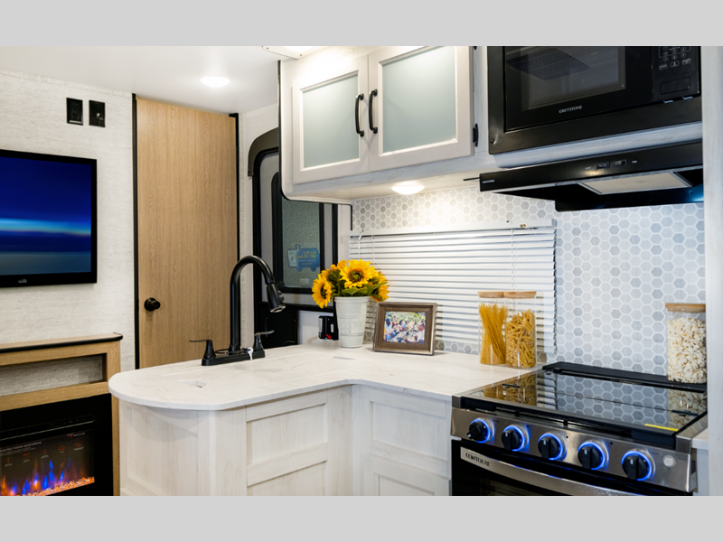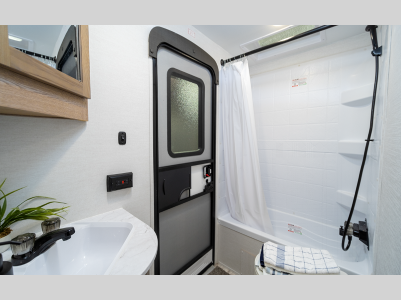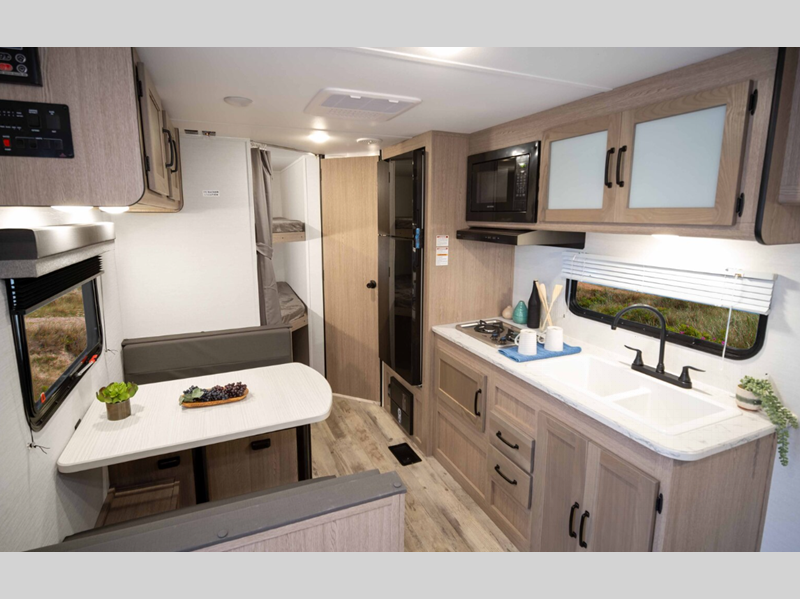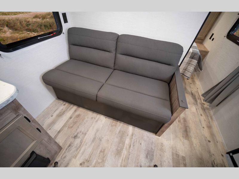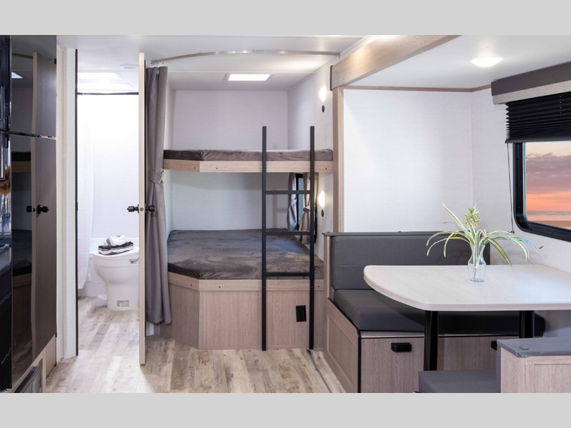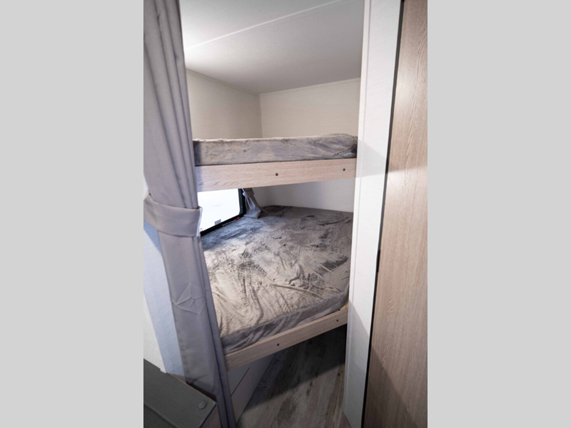 Sleeps 5 Slides 1 Length 23 ft 4 in Ext Width 8 ft Ext Height 10 ft 6 in Int Height 6 ft 8 in Hitch Weight 530 lbs Dry Weight 4430 lbs Cargo Capacity 1300 lbs Fresh Water Capacity 35 gals Grey Water Capacity 34 gals Black Water Capacity 34 gals Furnace BTU 20000 btu Number Of Bunks 2 Available Beds Queen Refrigerator Type Everchill Refrigerator/Freezer Refrigerator Size 10.7 cu ft Cooktop Burners 3 Number of Awnings 1 LP Tank Capacity 20 lbs Water Heater Type Tankless AC BTU 13500 btu Awning Info Electric with LED Lights Axle Count 2 Number of LP Tanks 1 Shower Type Tub/Shower Combo Electrical Service 30 amp Similar Floorplans