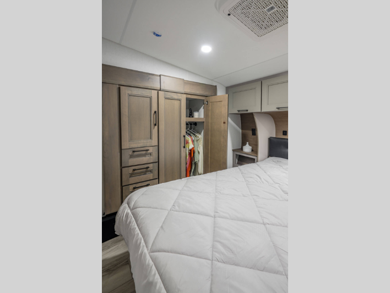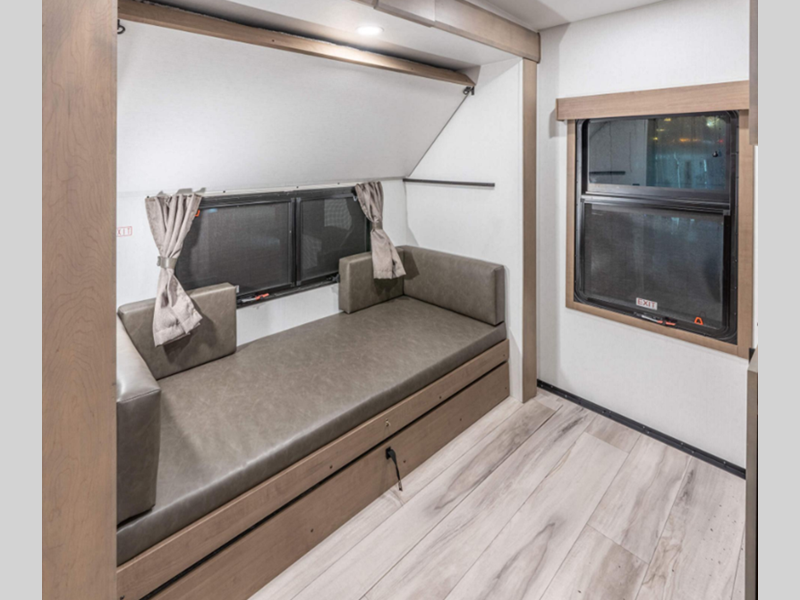 Each model is constructed with durable Tufflex roofing material, a steel powder coated frame, and a Lamilux gelcoat fiberglass. You will appreciate the All Weather Insulation Package that features a fully heated, insulated, and enclosed underbelly, and the RV airflow A/C system optimizes the airflow in your A/C by increasing airflow by an average of 40% for a smoother running A/C without all the extra noise. The exterior graphics are sure to turn heads as you travel down the highway, and the new cabinetry will have you feeling right at home. There are a variety of floorplans to choose from, all weighing under 12,000 lbs. for lightweight towing!