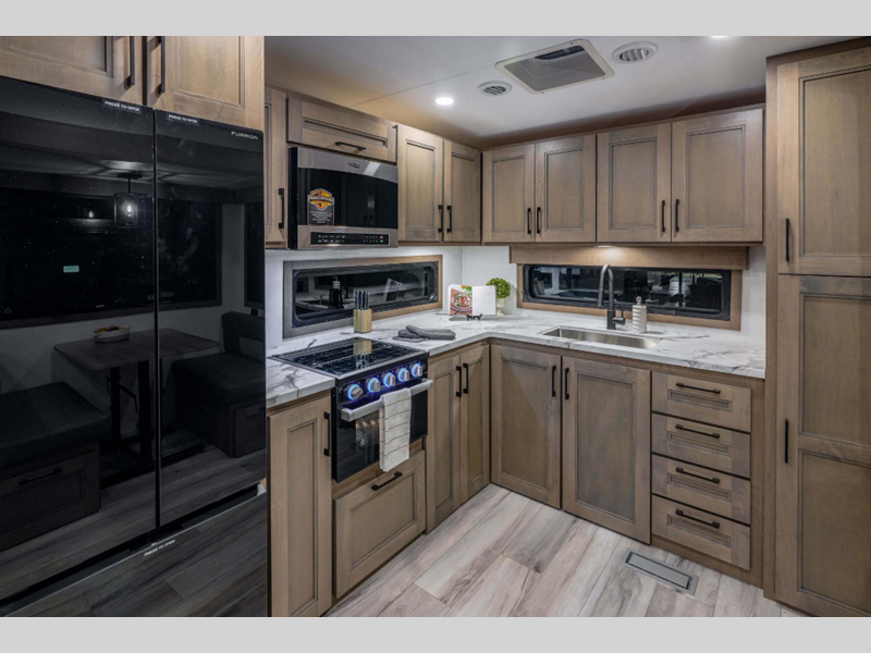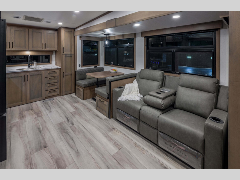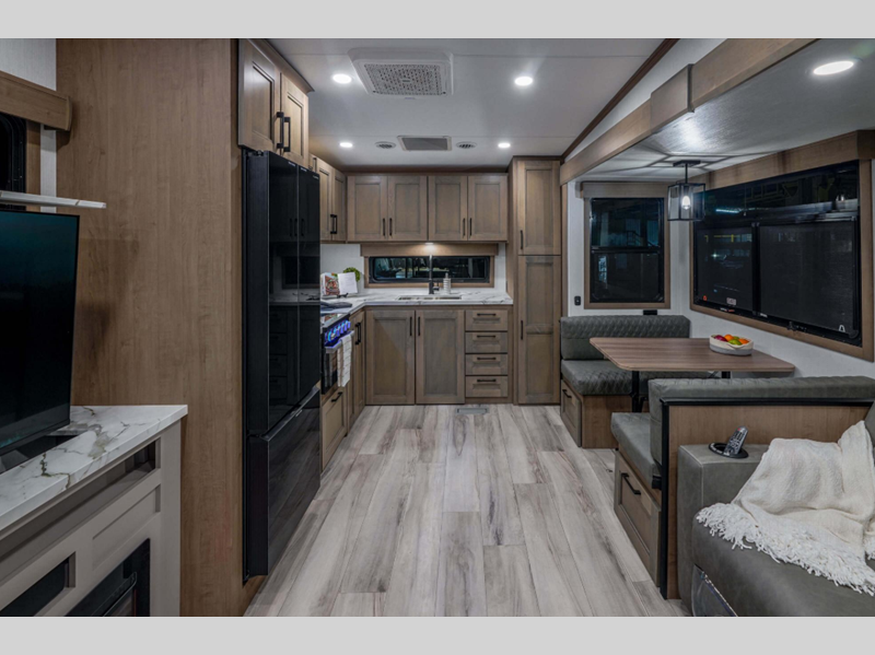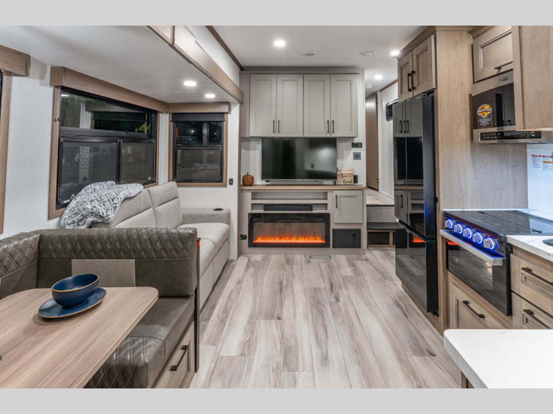 Sleeps 6 Slides 3 Length 34 ft 5 in Ext Width 8 ft Ext Height 12 ft 3 in Interior Color Mink, Pebble Exterior Color Polar White Hitch Weight 1610 lbs GVWR 11995 lbs Dry Weight 9850 lbs Cargo Capacity 2145 lbs Fresh Water Capacity 55 gals Grey Water Capacity 50 gals Black Water Capacity 50 gals Tire Size 16" Furnace BTU 35000 btu Available Beds Queen Refrigerator Type French Door Style Refrigerator Size 12 cu ft Cooktop Burners 3 Shower Size 30" x 36" Number of Awnings 1 Axle Weight 8240 lbs LP Tank Capacity 30 lbs Water Heater Type On Demand Tankless AC BTU 15000 btu TV Info LR 65" LED TV Awning Info 19' Electric with LED Lights Axle Count 2 Washer/Dryer Available Yes Number of LP Tanks 2 Shower Type Standard Electrical Service 50 amp Similar Floorplans