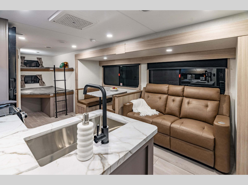 Sleeps 9 Slides 1 Length 31 ft 11 in Ext Width 8 ft Ext Height 10 ft 10 in Int Height 6 ft 6 in Interior Color Mink, Mushroom Grey, Noce Biscotti GVWR 8000 lbs Fresh Water Capacity 45 gals Grey Water Capacity 64 gals Black Water Capacity 32 gals Tire Size 15" Furnace BTU 30000 btu Number Of Bunks 2 Available Beds Queen Refrigerator Type 12 Volt Refrigerator Size 10 cu ft Cooktop Burners 3 Shower Size 30" x 40" Number of Awnings 1 LP Tank Capacity 20 lbs Water Heater Type Tankless AC BTU 13500 btu TV Info LR LED TV Awning Info 20' Power Axle Count 2 Number of LP Tanks 2 Shower Type Standard Electrical Service 30 amp Similar Floorplans