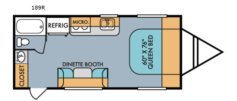 In Retro model 189R by Riverside RV, you will enjoy cooking on the two burner cook top, eating a meal or relaxing in the booth dinette, and sleeping in the queen bed with space to walk around it at night. These amenities are only the start of what you can find standard in 189R. If you check out our features and options list, you may find many options to add to make your trip just that much better.